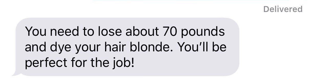 Listen, I’m fully aware I need to lose weight. I joke about wanting a sideline reporter body all the time. However, receiving this text from “Shawn” was not what I needed to stay motivated. I felt sick to my stomach. I put my dinner and phone down, letting the text sink in. Instantly I became fixated on everything “wrong” with me. My teeth, my nose and of course my figure. Friends reached out and told me not to listen to them and that my passion for writing would outshine any hair color.